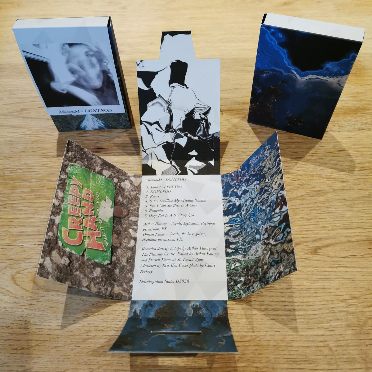 Home-dubbed aqua blue cassette with hand-made maltese cross artwork boxes.